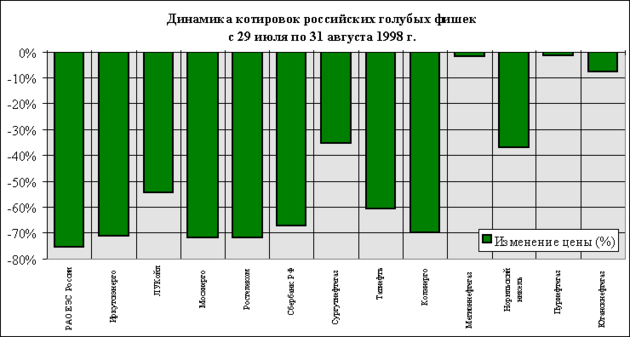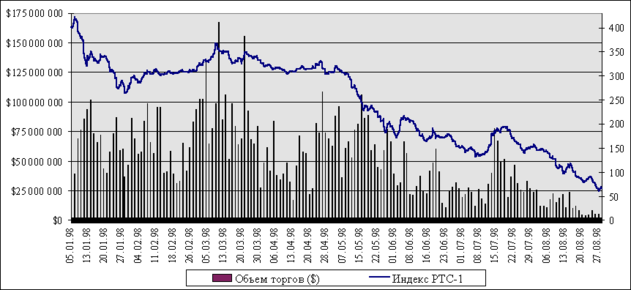 В августе 1998 года индекс РТС-1 стабильно снижался по тенденции, заданной еще с середины июля. За месяц его падение составило около 55%. Всего за 1998 год индекс РТС-1 снизился примерно на 83%, а с октября 1997 года - на 90%.