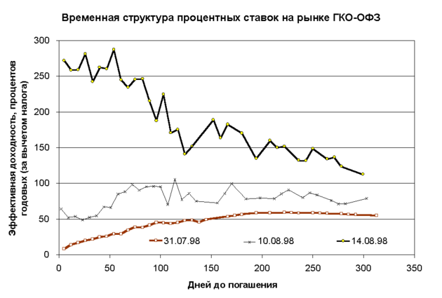 В августе рынок ГКО-ОФЗ прекратил свое существование. Продолжающийся отток средств нерезидентов с рынка, сложная политическая и экономическая обстановка, слабая позиция рубля, укрепили ожидания инвесторов о девальвации. Растущий спрос на валюту снижал ликвидность коммерческих банков, которые продавали государственные облигации с целью высвобождения рублевых ресурсов. В итоге, доходность выпусков увеличилась в несколько раз (рис. 1). В этих условиях Министерство финансов и ЦБ РФ прибегли к нестандартным мерам, остановив торговлю государственными ценными бумагами облигациями, и изменив порядок установленных выплат и погашения.