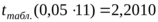 По таблице «Значение критерия t Стьюдента при уровне значимости 0, <0, 0,05,0,01» на основе заданной вероятности (0,95) и числа степеней свободы n-2(13-2=11) определим табличное значение критерия t Стьюдента.