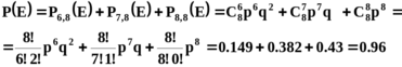 Пример: Для обслуживания покупателей супермаркета в час пик без очередей должно работать не менее 6 контролеров-кассиров из 8. Вероятность отсутствия одного из работников составляет 0,1. Найти вероятность работы расчетно-кассового узла без очередей.