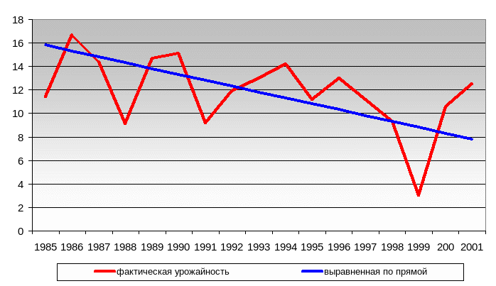 Как видно из таблиц 17 и 18, показатель урожайности с каждым годом уменьшается примерно на 0,5. отсюда можно сделать вывод о тенденции урожайности зерновых к снижению.