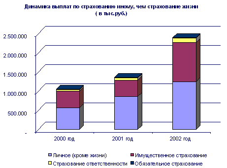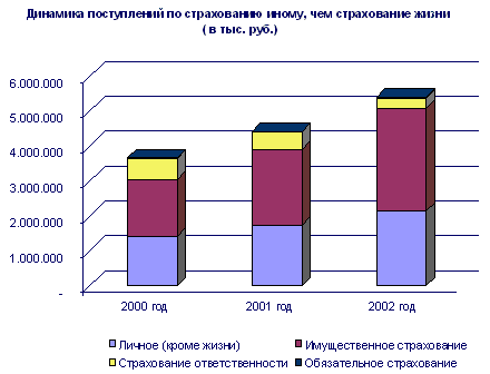 В 2002 г. общий объем страховых взносов составил 10 729 млн. руб. Наибольшая часть страховых взносов, поступившая по договорам страхования, приходится на имущественное и личное страхование. В 2002 г. было собрано страховых взносов по договорам страхования: по страхованию иному, чем страхование жизни: 5 399 млн. руб. (прирост по сравнению с аналогичным периодом 2001 года - 22 %), в том числе