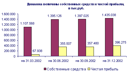 На протяжении 12 лет устойчиво и динамично увеличивается величина собственных средств ОАО "РОСНО". Рост собственных средств повышает финансовую устойчивость компании и создает базу для дальнейшего расширения деятельности. На конец 2002 г. собственные средства увеличились на 38,05 % по сравнению с началом года и составили 1 435 млн. руб. Чистая прибыль за 2002 г. составила 396 млн. рублей.