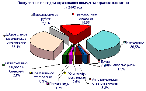 В 2002 г. общий объем страховых взносов составил 10 729 млн. руб. Наибольшая часть страховых взносов, поступившая по договорам страхования, приходится на имущественное и личное страхование. В 2002 г. было собрано страховых взносов по договорам страхования: по страхованию иному, чем страхование жизни: 5 399 млн. руб. (прирост по сравнению с аналогичным периодом 2001 года - 22 %), в том числе личное страхование, кроме страхования жизни: 2 153 млн. руб.; имущественное страхование: 2 940 млн. руб., страхованию ответственности: 306 млн. руб.