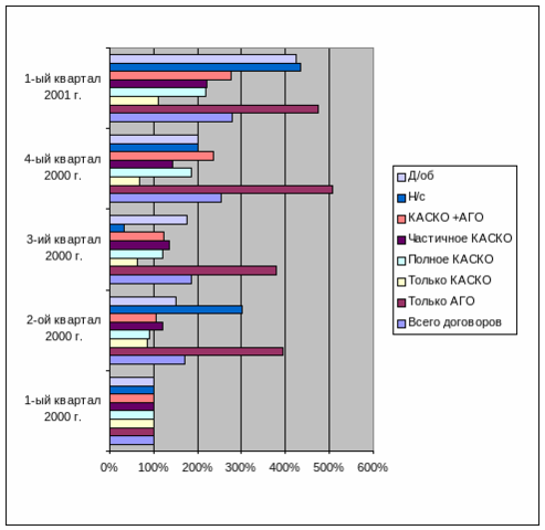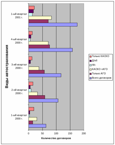 Наибольший темп роста наблюдается в графе «только АГО», что означает, что резко (на 373%) увеличилось количество договоров только автогражданской ответственности. Это говорит о том, что люди стали в первую очередь думать о своей ответственности перед другими участниками дорожного движения, страхование автогражданской ответственности становится наиболее популярным видом страхования. Одной из причин является то, что страхование автогражданской ответственности осуществляется независимо от года выпуска транспортного средства, его типа и водительского стажа, а также от количества лиц, допущенных к управлению транспортным средством. Небольшие поправочные коэффициенты или франшиза сглаживают некоторые повышенные факторы риска, но в любом случае страхователю этот вид страхования всегда выгоден. Общее количество договоров увеличилось на 179%, что является подтверждением устойчивого развития автострахования в компании. Значительным колебаниям подвергся показатель «только КАСКО». Как правило, только по программе каско страхуются автомобили, взятые в аренду, под залог которых взят кредит в банк, полученные путем заключения договора лизинга или перегоняемые автомобили. Видимо в первом квартале 2000 года и в первом квартале 2001 года таких договоров было больше, чем в других периодах. К сожалению, владельцы транспортных средств, которых банк или арендодатель обязывает страховать полное КАСКО почти некогда не заключают договор страхования автогражданской ответственности, хотя в случае ДТП по их вине они могут понести значительные потери, возмещая ущерб пострадавшей стороне. Как видно из таблицы, значительно выросло количество договоров по страхованию дополнительного оборудования.
