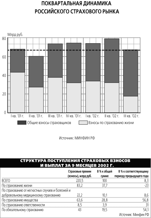 Российский страховой рынок переживает трудные времена. По данным Минфина, сборы страховщиков в III квартале 2002 г. упали до самого низкого уровня за год. Падение вызвано отказом лидеров рынка от так называемых зарплатных схем, для которых используется страхование жизни. Доля этого вида страхования в структуре поступлений составила 26% , а это минимальный показатель за последние три года.