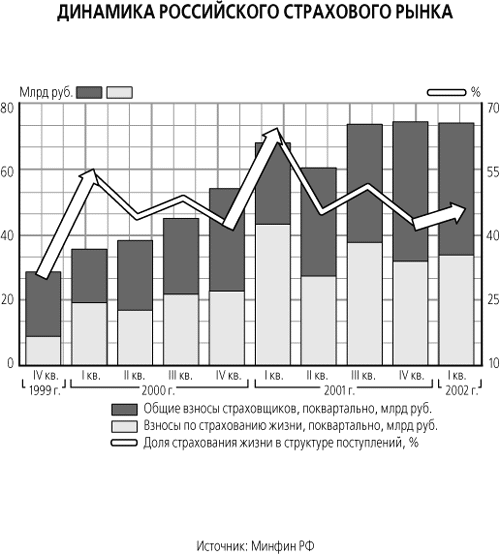 Обычно I квартал - самый удачный для страховщиков: именно в это время заключается наибольшее число договоров страхования. Так что до сих пор в истории российского страхового рынка не было случаев, чтобы сборы I квартала оказывались ниже, чем в предыдущие три месяца. Рост подстегивали в первую очередь резко увеличивающиеся сборы по страхованию жизни (в I квартале 2000 г. они выросли на 117% по сравнению с IV кварталом 1999 г., в I квартале 2001 г. - на 90% ). В I квартале 2002 года страхование жизни выросло лишь на 6%.