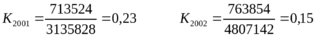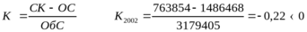 В 2001 г краткосрочные обязательства покрывались краткосрочными вложениями и денежными средствами всего лишь на 31%, в 2002 г. видно увеличение коэффициента, но рекомендуемое значение К0,7 не выполняется.