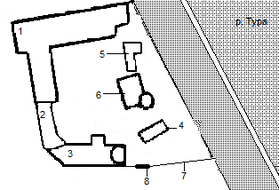 Форма плана монастыря неправильная, в виде прямоугольной трапеции.