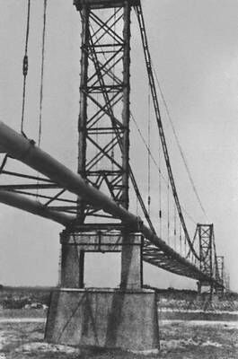В XX в. на территории СССР построен ряд висячих мостов весьма больших пролетов под трубопроводы (р. Амударья, L = 660 м; р. Днепр, L = 720 м) и временный мост пролетом 874 м через Волгу под конвейерную линию при строительстве ГЭС.
