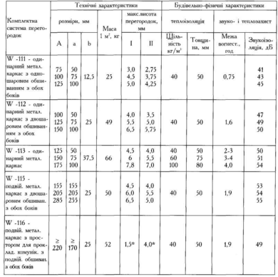 Міжкімнатні перегородки "Кнауф" можуть застосовуватися в житлових, цивільних і промислових будинках будь-яких конструктивних систем і типів, будь-якого рівня відповідальності (в тому числі і підвищеного) та будь-якого ступеню вогнестійкості при висоті будівель до 60 м. їх можна зводити в районах як зі звичайними, так і складними інженерно-геологічними умовами та сейсмічністю у 9 балів, а також у вітрових районах до п'ятого (V) включно. Найбільше застосування знайшли перегородки "Кнауф" серії W, типи яких подані в табл. 1.
