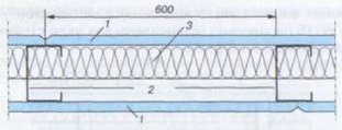 1 - подвійна гіпсокартонна обшивка; 2 - металевий каркас; 3 - звукоізоляційний матеріал
