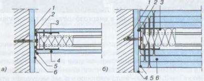 1 - дюбель; 2 - пружна стрічка (герметик); 3 - CW- профіль; 4 - ГКП; 5 - шпаклівка Уніфлотт; 6 - стрічка розпольна.