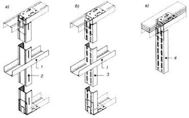 Варіант улаштування дверного прорізу: а) з використанням-CW-профіля; б) з використанням - UW-профіля; в) з фрамугою. 1 - профіль верхнього порога дверей; 2 - CW-профіль; З - UW-профіль; 4-ОМ-профіпь або UW-профіль.