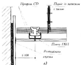 Підвіс основних профілів каркасу здійснюється за допомогою: прямих підвісів П (довжина від 4 до 12 см); швидких підвісів Т і кронштейнів (довжина від 12 до 150 см);