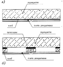 нанести клей "Стіропорклебер" на декоративну полістирольну плиту гребінковим шпателем по всій її поверхні або плямами (по кутах і по середині) і приклеїти на поверхню перекриття рядами у взаємно перпендикулярних напрямках, починаючи від центру.
