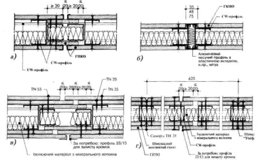 Конструкції деформаційних швів в гіпсокартонних перегородках: а - при одношаровому гіпсокартонному обшиванні з прокладанням за швом гіпсокартонних плит та з облямівкою обшивання; б - при одношаровому обшиванні з встановленням в зоні шва спеціального профілю; в - при двошаровому обшиванні з прокладанням за швом гіпсокартонних плит врозбіжку та з облямівкою обшивання; г - при двошаровому обшиванні з встановленням в зоні шва спеціального профілю та компенсувального клапану