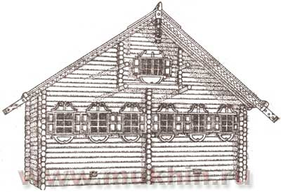 Завершалась такая крыша треугольником, вырубленным из бревна. Кровля настилалась по слегам, врубленным в концы самцов и представляющим собой обрешетку. Такую конструкцию крыши и по сей день применяют на Севере нашей Родины. Архитектура самцовой крыши не ограничивалась треугольной формой. Меняя длину самцов, получали крышу в виде башни, которая получила название "бочки" (рис. 3).