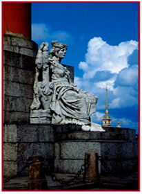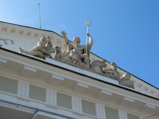 Скульптурные группы по своему содержанию перекликаются со скульптурой Ростральных колонн. Монументально-декоративная скульптура пластически обогащает архитектуру в целом и создает сильный декоративный эффект.