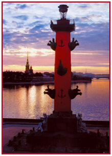 Силуэт и масштаб здания еще сильнее подчеркивают Ростральные колонны, которые установили рядом со спуском к Неве. В первое время они выполняли и чисто практическое назначение - были маяками: по винтовой лестнице внутри колонны на верхнюю площадку поднимался служитель и зажигал там огонь. Две ростральные колонны преобразуют значительный объем Биржи в вертикаль. Эта вертикаль утверждает здание Биржи в качестве смысловой доминанты огромного речного пространства. Ростральные колонны, мощные по объему и выразительные по силуэту, цвету и пропорциям, четко вырисовываются на фоне неба и хорошо видны с далеких перспектив.