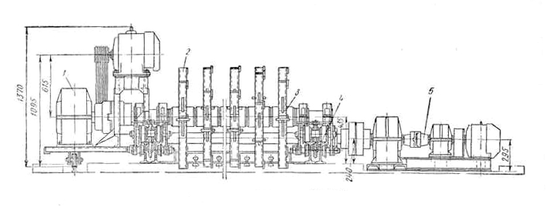 Мал. 13. Двухвальний глиноспушувач конструкції Ленстройкераміки: 1 - бункер ящика подавателя, 2 – електродвигун потужністю 10 квт, 3 - редуктор РМ-650, 4 - бункер розпушувача, 5 - спушувальні вали з билами, 6 - шестерна передача