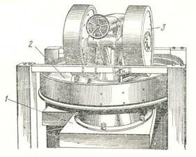 Мал. 22. Бігуни для мокрого помелу: 1 — підстава машини, 2 — чаша, 3 — катки