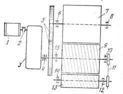 Мал. 20. Кінематична схема вальців: 1 — електродвигун, 2 — пружна муфта, 3 — редуктор, 4 — зрівняльна муфта, 5 — зубчаті колеса, 6, 8, 10, 12, 14 і 15 — підшипники, 7 — гладкий вал, 9 — гвинтовий вал, 11 — ланцюгова передача, 13—очисний скребок