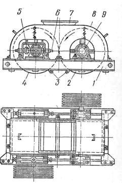 Мал. 25. Вальці тонкого помелу: 1 — станина, 2, 4 — валяння, 3 — скребок, .5— амортизація, 6 — регулювальний гвинт, 7— завантажувальна воронка, 8 — кожух, 9 — підшипникові опори
