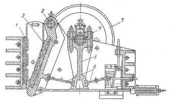 Мал. 26. Щокова дробарка Щ-5: 1 — нерухома щока, 2 —подвижна щока, 3 — шарнір, 4 — ексцентриковий вал, 5 — шатун, 6 — плити розпорів, 7 — маховик