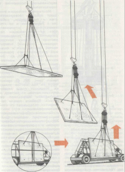 Панель перекриття може бути без монтажних петель, в цьому випадку її стропу захватують пропускаючи захоплення в отвори в панелях, повертають сухар захоплення в горизонтальне положення. Далі стропують панель універсальним багатогілковим стропом за петлі захоплень і піднімають. За допомогою універсального стропа панель переводять на вазі з вертикального положення в горизонтальне. Панелі перекриття в залежності від їх розміру мають чотири, шість і більше місць стропування: монтажних петель або отворів.