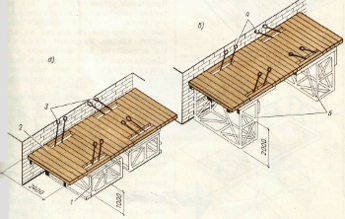 Підмости (табл. 4) - це тимчасові пристрої, встановлювані на перекритті і дозволяючі виконувати кладку в межах висоти поверху. Підмости (Рис.) повинні бути зручними при установці і транспортуванні; задовольняти вимогам техніки безпеки; бути інвентарними, тобто використовуватися багатократно. Для кладки стін багатоповерхових житлових будівель застосовують наступні типи подмостей.