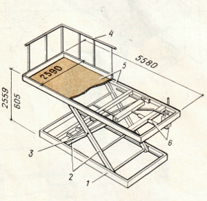 1 - опорна рама; 2 - рухомі важелі; 3 - шарнір; 4 - знімна огорожа; 5 - платформа з рабочим настилом; 6 -гидросистема