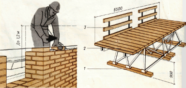 З рівня, де працює муляр, можна виконувати кладку тільки до висоти 1,2 м (Рис.). Для подальшого зведення конструкції необхідні підмости.