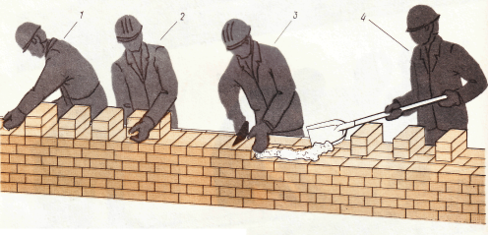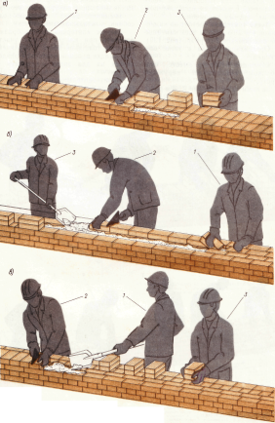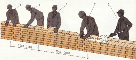 Провідний муляр викладає верстові ряди і контролює правильність кладки. Він рухається за підсобником, що розкладає цеглину і розстилаючим розчин. В цей час інший підсобник укладає забутку.