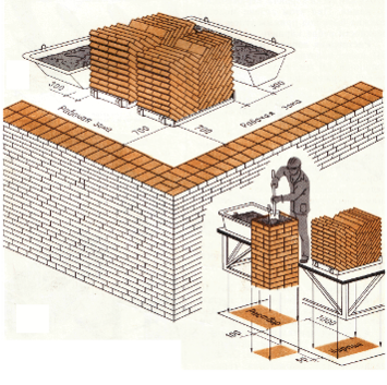 Щоб муляри виконували менше рухів, піддони з цеглиною ставлять напроти простінків. Ящики з розчином встановлюють напроти отворів, довгою стороною перпендикулярно стіні, що зводиться.