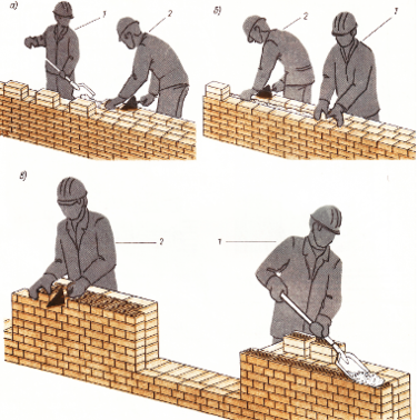 При кладці простінків (4, б) на одному з них підсобник розкладає цеглину і розстилає розчин, а на іншому простінку провідний муляр веде кладку. Потім вони міняються місцями і продовжують роботу.