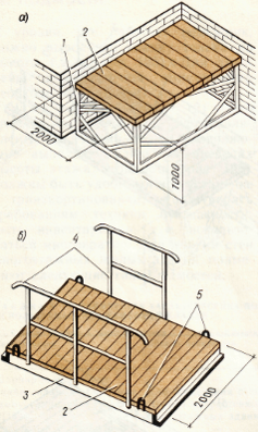 а - для кладки стін лоджій, перегородок; би - длякладки стін сходових кліток; 1 - сталева опора-тумба; 2 - дощатий настил; 3 -сталева рама; 4 - огорожа;5 - петливши для строповки