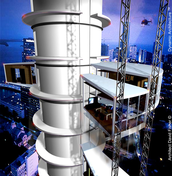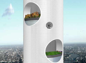 "Зеленою" енергією будинок повинні (хоча б частково) забезпечувати вітряки, а більші круглі прорізи в тілі цього хмарочоса-труби повинні гарантувати доступ світла висячим садам (мал. 4.2). Взагалі ж, круглі отвори різного розміру в тілі вежі повинні випливати один за одним кожні 20 поверхів.