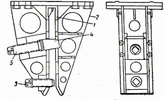 Наиболее выгодным, с точки зрения удовлетворения поставленным выше трем условиям, оказался клиновый наголовник, предложенный В.Н. Тупиковым и автором. К плите наголовника с помощью болтов, проходящих через нижнюю плиту вибратора, крепятся две массивные щеки 1, между которыми заводится погружаемый шпунт. Щеки наголовника и шпунт имеют отверстия, в которые заходит клин 2. Заводка последнего осуществляется винтом 3, вращающимся в массивной гайке 4, укрепленной к ребрам одной из щек наголовника.
