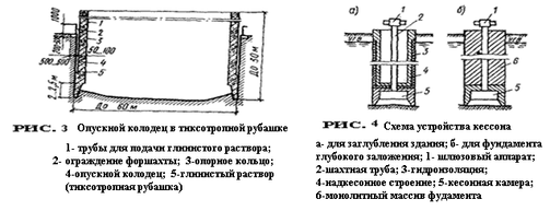 Способ кессона применяют в сильнообводненных, крупнообломочных или скальных грунтах, когда нежелательны осадки расположенных вблизи сооружений или имеется опасность наплыва грунта в колодец. Последовательность производства кессонных работ заключается в том, что сначала сооружают кессонную камеру (рис. 4), на потолке которой монтируют шахтную трубу и шлюзовый аппарат. От компрессорной станции в камеру нагнетают сжатый воздух, вытесняющий из нее воду. Грунт в кессоне разрабатывают гидромеханическим способом или вручную. По мере погружения на потолочной части камеры возводят надкессонное строение.