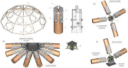 С точки зрения автора, одной из основных технических задач при конструировании узловых сопряжений куполов является создание наконечников, которые бы обеспечивали простоту соединения деревянных стержней с узловыми элементами и были бы способны воспринимать усилия сжатия и растяжения, возникающие от внешних нагрузок. Так как задачей является создание сборно-разборных конструкций, то в качестве наконечников деревянных стержней рационально использовать изделия из металла.