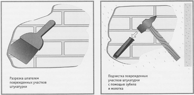 Перед ремонтом монолитной штукатурки всю оштукатуренную поверхность простукивают молотком и снимают осыпающий слой.