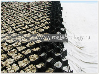 Основной принцип работы двуосных георешеток состоит в исключении взаимопроникновения конструктивных слоев и фиксации заполнителя за счет расклинивания его частиц в ячейках георешетки. При заполнении и уплотнении инертным материалом ячеек георешетки, частицы материала фиксируются в ячейках, и создается эффект "механической стабилизации". Двуосная георешетка обладает высокой жесткостью, что позволяет выдерживать высокие нагрузки при низких деформациях.