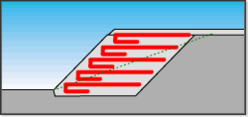В зависимости от условий строительства укрепление с применением георешеток может быть как однослойным с горизонтальной прослойкой из геотекстиля, так и многослойным, обеспечивающим равномерное армирование всего массива земляной насыпи.