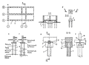а — фрагмент плана фундамента под несущие стены; б - фундамент под колонну; в – фундамент на сваях-стойках; г – тоже на висячих сваях; д — стык сборного ростверка с забивной сваей; e - свая; 2 — ростверк; 3 — оголовок сваи; 4 — колонна; 5 — монолитный ростверк стаканного типа под колонну; 6 - арматура сваи: 7 - свая-стойка; 8 - висячая свая; 9 — монолитный ростверк; 10 – бетон замоноличивания; 11 – закладная деталь; 12 – стальная деталь; 13 – панель перекрытия; 14 – панель стены; 15 – цементный раствор