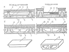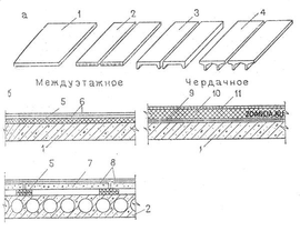 а —виды несущих плит; б— конструкции перекрытий; 1 — сплошная плита (Y=400 кг/м2); 2 — круглопустотная; 3 — ребристая; 4 — типа ТТ; 5 — изоляция ударного шума; 6 — пол по стяжке; 7 — усиление изоляции воздушного шума (гипсобетонные плиты по лагам); 8 — пол; 9 — пароизоляция; 10—теплоизоляция; 11 — стяжка.