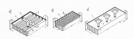 а — ребристое, 6— кессонированное, в — безбалочное 1 — плита, 2 — главная балка(ригель)
