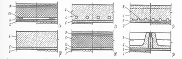 а-в – невентилируемые; г, д – частично вентилируемые; е – вентилируемые; 1 – защитный слой;2 – гидроизоляционный ковер; 3 – стяжка; 4 – несущая плита; 5 – утеплитель; 6 – пароизоляция; 7 – однослойная ограждающая и несущая конструкция; 8 – каналы и борозды; 9 – воздушная прослойка; 10 – подкладки.