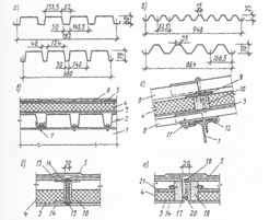 а-в – применение стального профилированного настила(а,б – профили;в – утепленное покрытие)