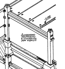 Сквозные диафрагмы жесткости образуются путем заполнения каркаса стенками располагающихся в плоскости и из плоскости рам. Они устанавливаются на всю высоту здания. Диафрагмы жесткости обычно совмещаются со стенами лестничных клеток, лифтовых шахт и с разделительными перегородками помещений.